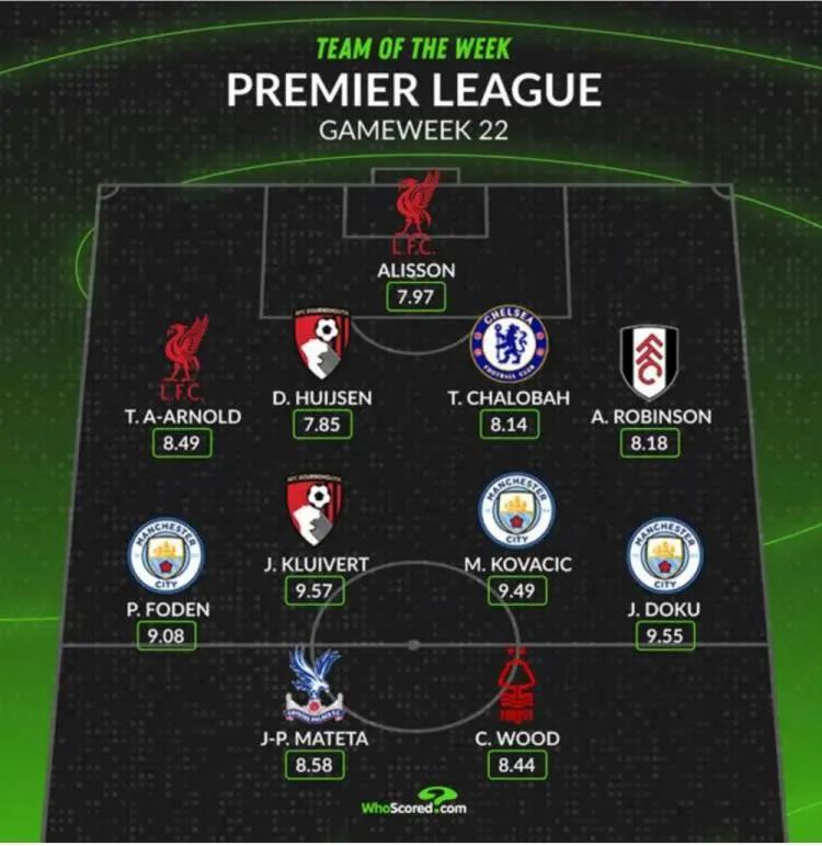 中场:福登(曼城)、小克鲁伊维特(伯恩茅斯)、科瓦西奇(曼城)、多库(曼城)
