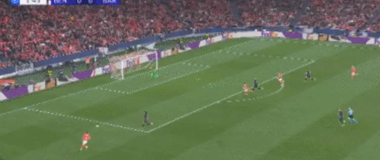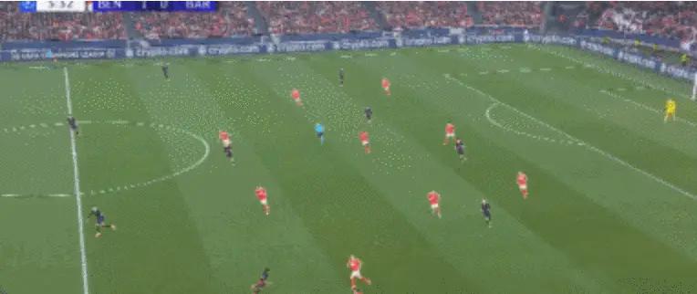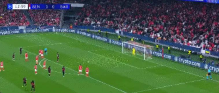 第64分钟,本菲卡门将开球出现失误,送巴萨2-3追回一球。