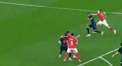 巴尔德突入禁区,本菲卡后卫托马斯没能踢到皮球,反而一脚踩在了巴尔德的脚面上,裁判第一时间判罚角球,好在有VAR的存在,裁判该判点球。