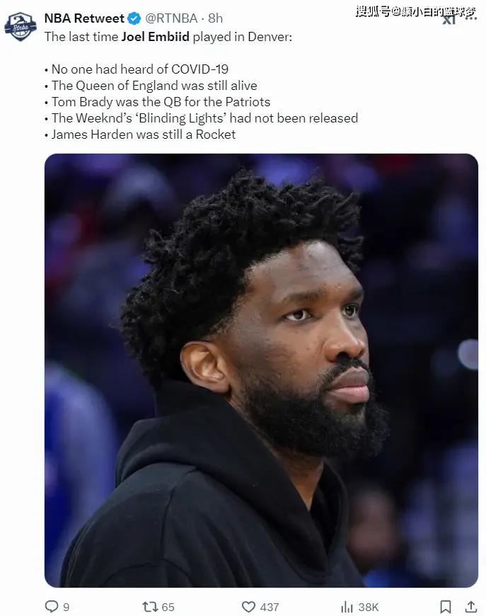 因为此役客场恩比德打掘金继续无缘登场,上一次恩比德在丹佛登场还要追溯到2019年,接近2000天没有在掘金主场打过球,上一次恩比德在这里打球,哈登还在火箭队。