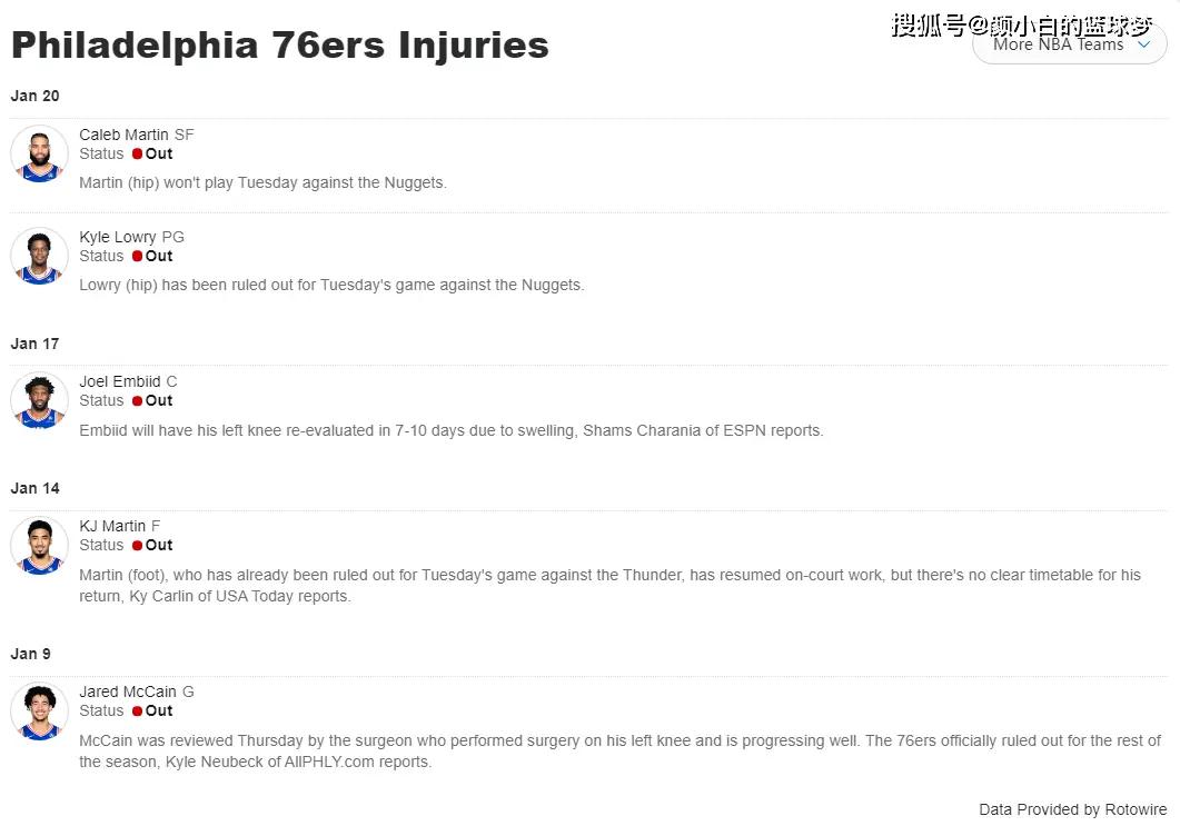 费城76人目前伤病名单上还有5人:马丁、洛瑞、恩比德、小马丁、麦凯恩。恩比德1月17日的伤病报告显示还需要7-10天的休养时间,他的膝盖肿胀7-10天后再复查。