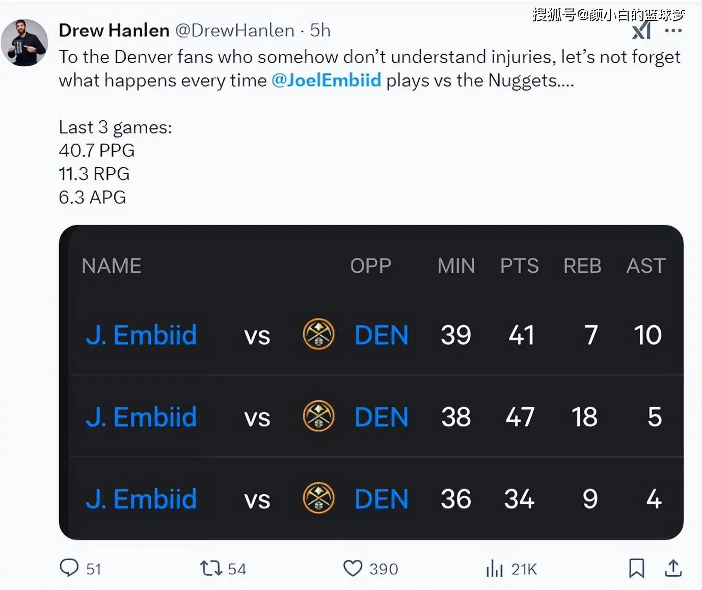不过恩比德最近三场打掘金,场均40.7分11.3篮板6.3助攻,费城球迷为他辩护,认为掘金球迷嘲讽恩比德没有必要。