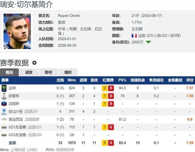 切尔奇现年21岁,身高1.77米,左右脚球员,主打前腰位置,也可以踢左边锋和右边锋,与里昂的合同至2026年6月底,德转身价已经从2000万欧元涨至3000万欧元。本赛季至今,切尔奇各项赛事共为里昂出场22次,其中15次首发,贡献5球8助。