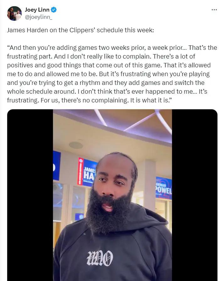 值得注意的是,由于1月12日和黄蜂的比赛延期,联盟在短短8天内安排快船进行了5场比赛,其中还包括两次背靠背的安排。这种紧张的赛程显然给球员们带来了极大的压力。哈登在赛后对赛事安排表达了不满:“过去一两周,加赛让我们的赛程变得混乱,我对此感到非常恼火。我并不喜欢不停地抱怨,但这样的情况确实让我很难找回节奏。这样的安排以前从未出现过,实在让我感到沮丧。”