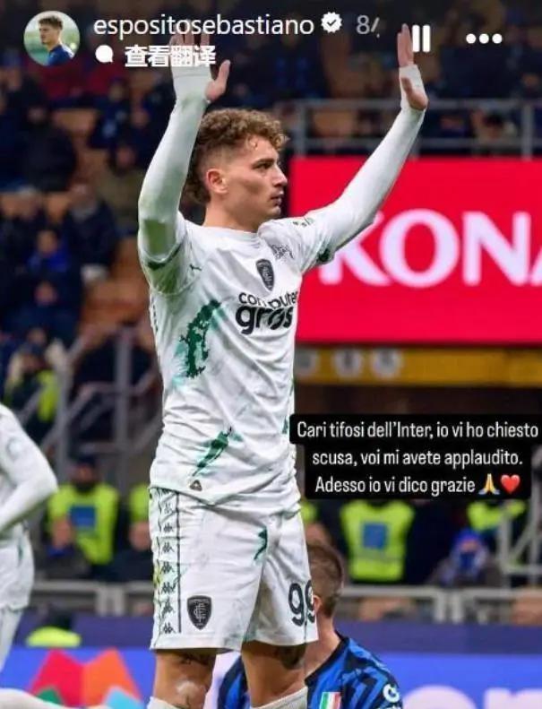 在最近一场意甲联赛中,埃斯波西托代表恩波利进球,帮助球队3-1战胜国米。赛后,他在社交媒体上向国米球迷致歉:“亲爱的国米球迷们,我要向你们道歉,你们曾给予我掌声,现在我想对你们说声谢谢。”
