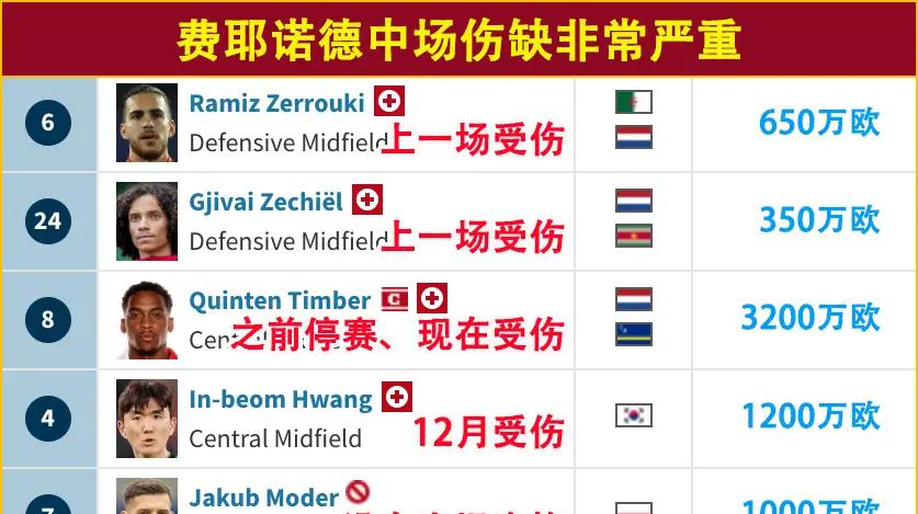尤其在硬实力方面,费耶诺德的伤病问题尤其严重。在对布雷达的比赛中,他们接连失去了两名后腰泽鲁基和泽基尔,这导致球队失去了所有五名合格后腰球员,亟需解决的人手短缺使得比赛难度陡增。如今,缺乏后腰的队伍在当今足球赛场上几乎无从控球。
