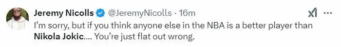 另一名记者则直言,若还有球员能够与约基奇抗衡,那么只会是自欺欺人。在传奇中锋奥尼尔看来,至今无人能与约基奇相提并论,他毫不犹豫地称其为联赛最为杰出的大个子。