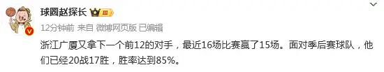 媒体人“赵探长”发文点评:浙江广厦又拿下一个前12的对手,最近16场比赛赢了15场。面对季后赛球队,他们已经20战17胜,胜率达到85%。