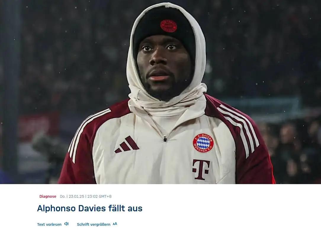 阿方索-戴维斯在周三对阵费耶诺德的欧冠比赛中(0-3 落败),左大腿后侧肌肉拉伤。拜仁慕尼黑俱乐部医疗部门的检查结果证实了这一伤情,他短期内将无法为拜仁出战。