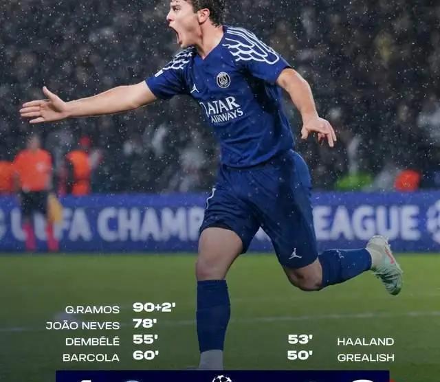 就在观众以为曼城会稳操胜券时,原来曾备受争议的登贝莱率先攻入一球,揭开了大巴黎的反击序幕。随后巴尔克拉、若昂-内维斯和拉莫斯相继得分,大巴黎最终连下四城成功逆转。这也是大巴黎历史上首次在欧冠单场落后两球情况下实现逆转,成为法国第五支在欧冠中完成该壮举的球队。