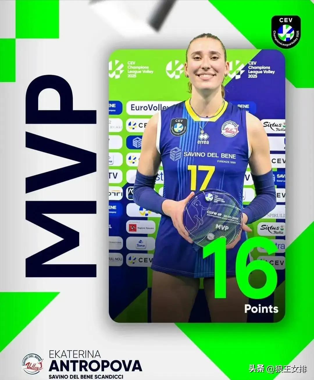 叶卡捷琳娜.安特洛波娃(斯坎迪奇)? 16分(32扣13中5失误0被拦 成功率41%,3发),安娃是斯坎迪奇俱乐部的核心球员,场场得分最高,进攻的倚仗,球队的大腿。2米多的安娃这个赛季进步很大,失误减少了,进攻得分能力增强了,发球拦网都发挥强势,大有超越老牌四大接应之势。