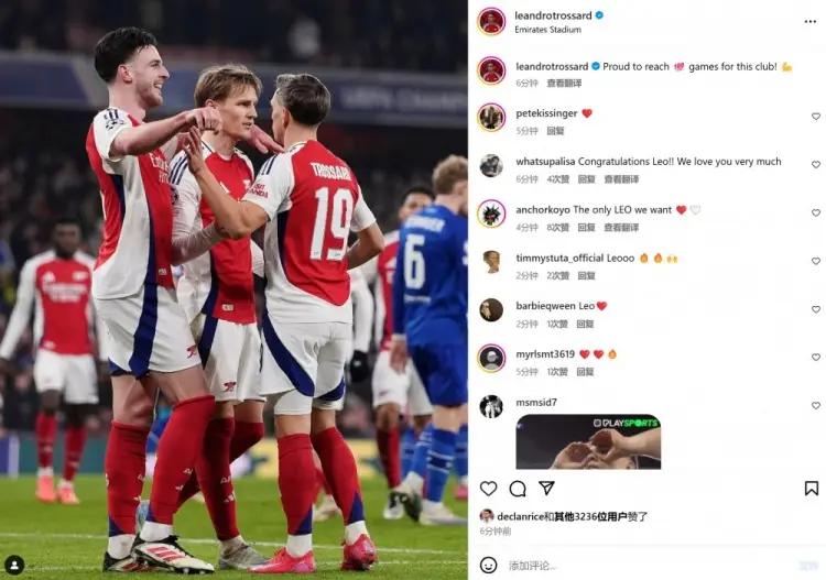 特罗萨德在赛后晒出了一张庆祝照片,并配文写道:“很自豪能够达成为阿森纳效力100场里程碑!”这标志着他在阿森纳的职业生涯达到了一个重要的里程碑。自加盟阿森纳以来,特罗萨德逐渐成为球队的重要一员,无论是在英超还是在欧冠赛场上,他的表现都给人留下了深刻印象。