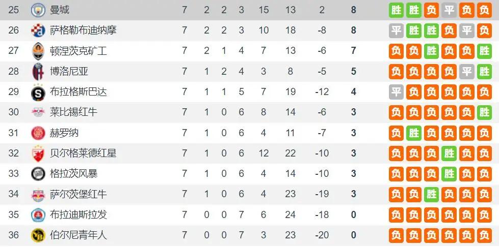 最让球迷意外的是本赛季欧冠开始前第一夺冠热门球队曼城竟然身处淘汰区,曼城7轮欧冠战罢2胜2平3负仅拿了8分,目前排名第25名,也就是淘汰赛区第一名。
