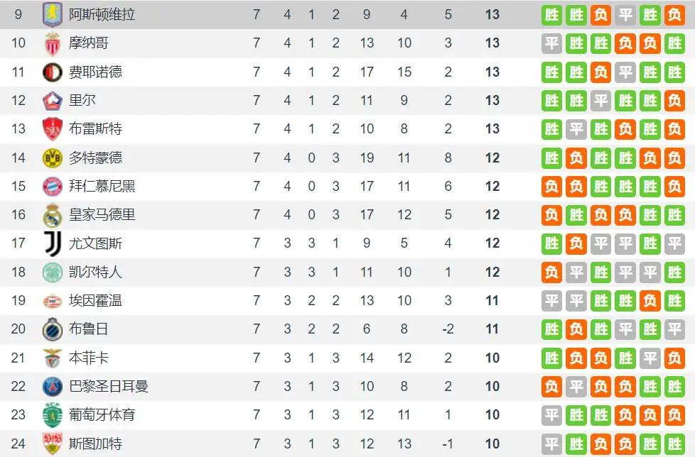 利物浦排名晋级区第一,而英超另一支球队阿斯顿维拉积13分与第8名同分,目前排名附加赛区第一,同积13分的还有摩纳哥、费耶诺德、里尔、布雷斯特,因此争夺欧冠联赛阶段前八直接晋级名额会非常激烈。