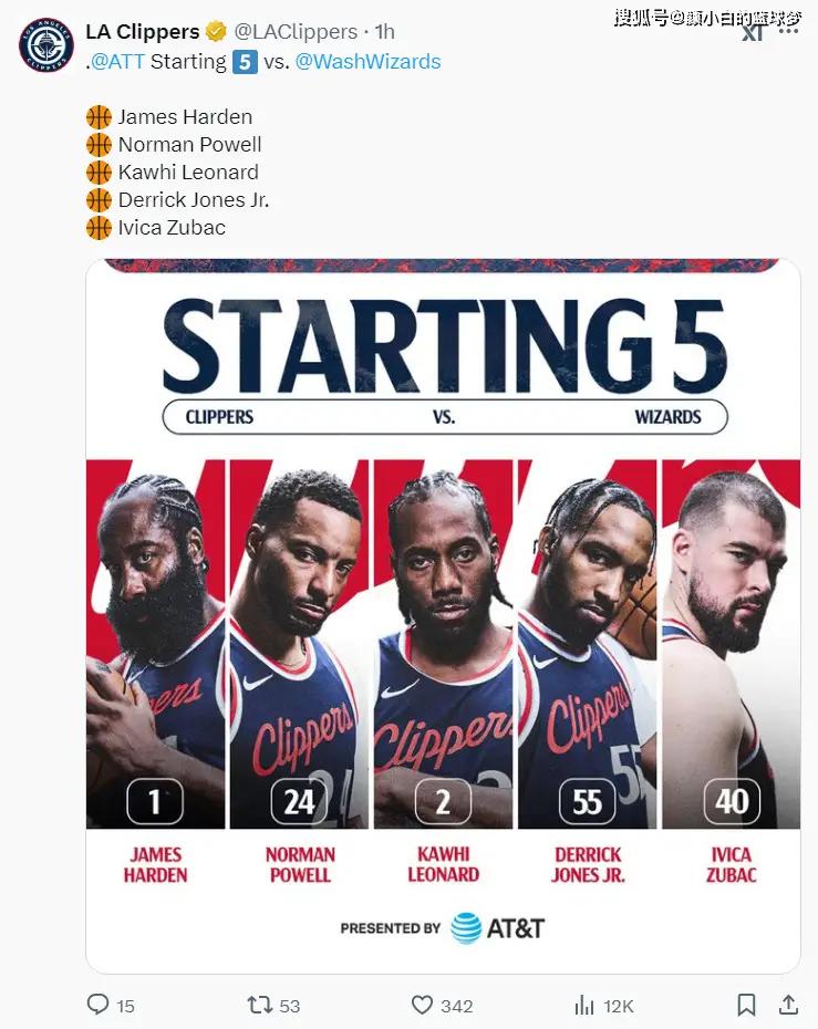 此役是快船背靠背的第二场,昨夜快船刚刚与绿凯鏖战加时惜败,不过对阵绿凯的比赛哈登、伦纳德都没打,此役快船是全主力出战——哈登、鲍威尔、琼斯、伦纳德、祖巴茨,首节快船就轻松领先10分,可以说全主力的快船打奇才这种弱旅太轻松了。