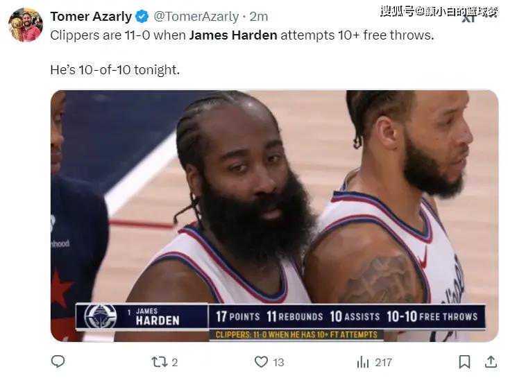 根据快船记者Tomer Azarly的报道,当哈登本赛季10+罚球时快船11胜0负,这场比赛他是10罚10中。