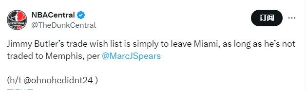北京时间1月24日,据名记斯皮尔斯报道,接近巴特勒的消息人士透露,巴特勒目前只想离开迈阿密,他愿意加盟任何球队,只有一个例外,那就是孟菲斯灰熊。斯皮尔斯还表示,一旦交易完成后,他愿意在新球队打到退役。