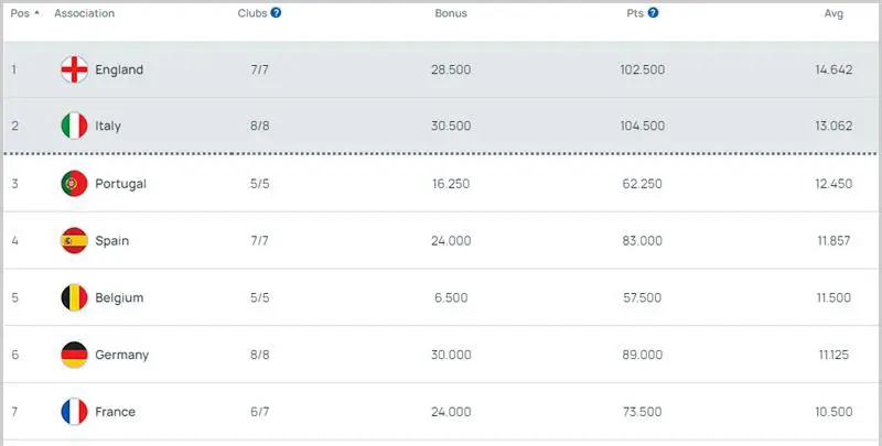 根据最新的欧足联排名,英超联赛遥遥领先,位列所有联赛的第一名,与第三名的葡超有2分以上的差距,与西甲相比则多出近3分,基本锁定了前两名。英超联赛的第五名有很大机会获得直接晋级欧冠的奖励名额,而意甲联赛能否保持5个名额则存在挑战。