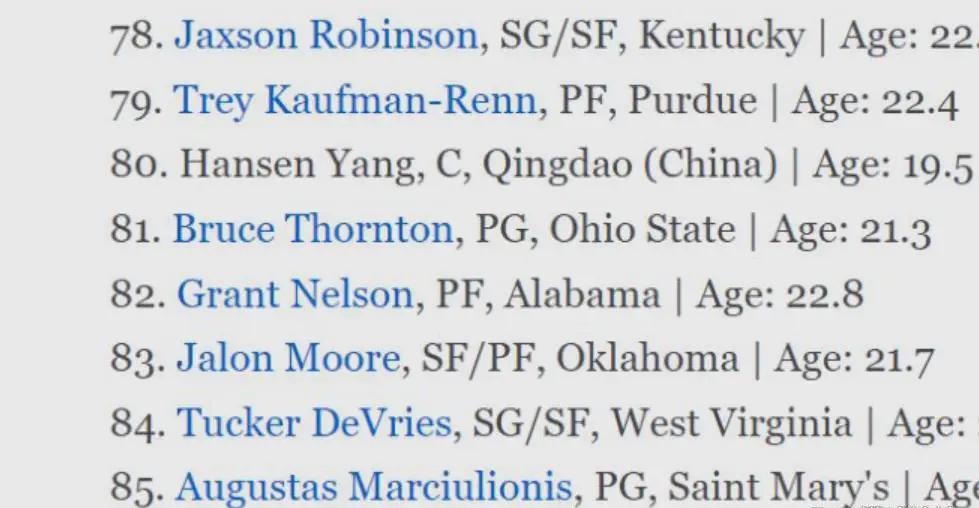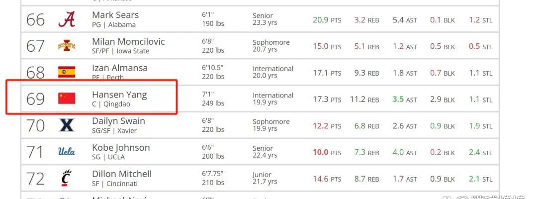 然而,备受关注的中国男篮未来之星杨瀚森再次出现在选秀榜单上,虽然仍被视为可能落选秀,但他成功进入TOP100名单,位列第69位。
