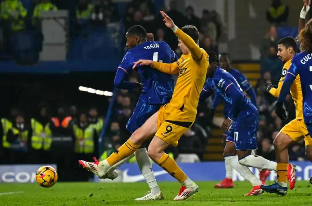 比赛进行到第 24 分钟,切尔西获得了一次宝贵的角球机会。詹姆斯站在角球点前,眼神中透露出坚定和自信。他助跑、起脚,足球如同炮弹一般飞向狼队的球门。足球在飞行过程中产生了折射,让狼队的防守球员们一时不知所措。就在这时,切尔西的中后卫阿拉达比奥尤迅速插上,抢在狼队门将之前将球打进。球进了!斯坦福桥球场顿时响起了震耳欲聋的欢呼声,切尔西的球迷们兴奋地挥舞着手中的旗帜,庆祝球队取得了领先。边裁第一时间举旗示意阿拉达比奥尤越位,但 VAR 介入后,裁判经过仔细查看回放,最终宣布进球有效。阿拉达比奥尤本赛季已经打进了 4 个进球,他在防守端表现出色的同时,还能在进攻端为球队做出重要贡献,不愧是一名妥妥的带刀侍卫。