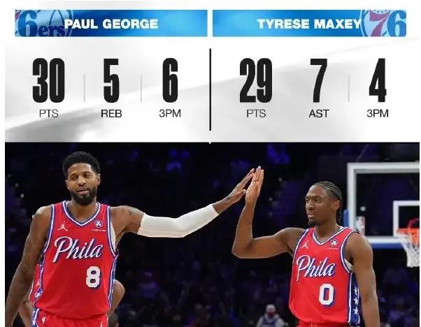 本场比赛,76人能够在缺少核心恩比德的情况下战胜东部领头羊,乔治和马克西的出色发挥功不可没。乔治全场21投11中,三分球11投6中,砍下30分5篮板3助攻。马克西则打出了全能表现,贡献29分3篮板7助攻2抢断2盖帽,攻防两端都表现出色。