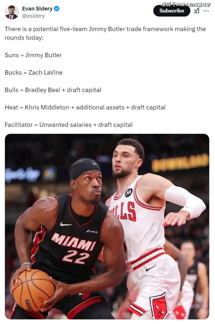 福布斯记者埃文-斯迪瑞报道,巴特勒交易去太阳的交易可能是一笔潜在的五方大交易,巴特勒去太阳,雄鹿得到拉文,公牛得到比尔+选秀权,火箭得到米德尔顿+到期合同+选秀权,第五方配平薪资+选秀权。(这个细节过于复杂,目前还没有实质性的进展)