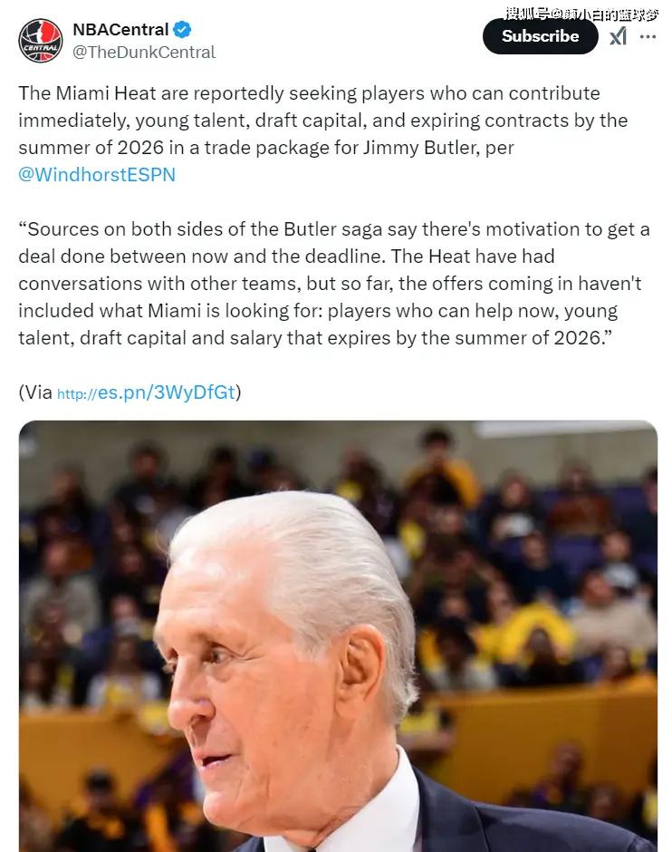 北京时间1月25日,ESPN记者布莱恩-文霍斯特报道,迈阿密热火与巴特勒的团队都在积极推动交易,双方都希望在交易截止日前完成交易,只可惜热火方面收到的报价都不够满意,莱利想要即战力、年轻球员、选秀权、2026年夏的到期合同。