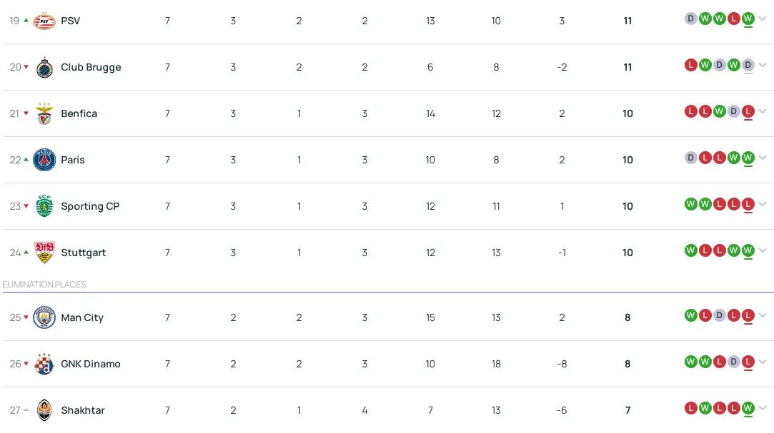 至于只积7分的矿工,虽然仍有晋级可能,但10分无法超越战平的巴黎与斯图加特(11分)。因此,可以说只要这两支球队战平,会有曼城(或布鲁日)、萨格勒布迪纳摩和顿涅茨克矿工三支球队排名低于他们,那么几乎势必能够晋级附加赛。