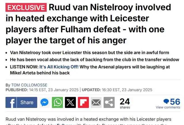48岁的主帅范尼斯特鲁伊,在执教莱斯特城的这段时间过得并不顺利。最新曝料显示,他在球队输给富勒姆后与球员发生激烈争吵。对于冬季转会窗口的安排,范尼感到非常失望,认为俱乐部在支持方面做得不够。