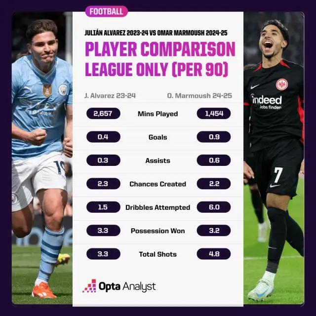 这样的位置和性能,曼城“非要买”马尔穆什的理由就很充分了:补上阿尔瓦雷斯离开的缺口,改变哈兰德之外球队就再无稳定火力输出点的现状。就此有人可能会嘲笑蓝月:早知如此,何必当初?英超卫冕可能大概率已经被断送,这一卖一买转会费实际也没赚到。但放走“小蜘蛛”原本就情非得已,阿尔瓦雷斯想要的主力位置,瓜迪奥拉暂时给不了。而补进马尔穆什也未必只是亡羊补牢,如果一切顺利调教得当,成为一种“升级”也未尝没有可能——虽然跨联赛和跨时段对比并不公平,但仅作为参考,马尔穆什当下的表现相比上赛季的阿尔瓦雷斯也确实强了很多,比如场均进球、助攻数他都是小蜘蛛的两倍以上,场均带球突破的尝试次数更是6比1.5遥遥领先。