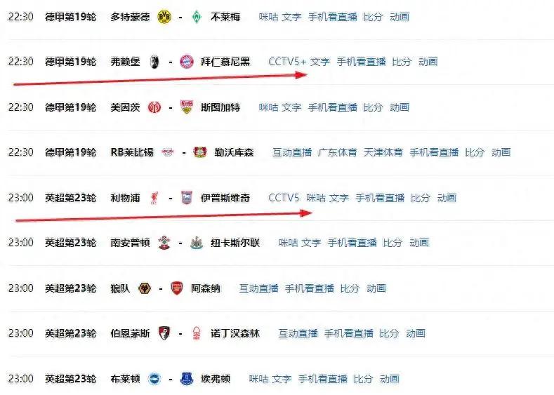 北京时间1月25日,时间再次来到周末,这两天又将上演五大联赛的足球盛宴,英超方面利物浦、阿森纳相差6分,将继续争冠,前欧冠亚军热刺则跌至倒数第6,要为保级而战,德甲方面拜仁领先勒沃库森4分,也将继续争冠。本轮五大联赛将上演争冠大战和保级大战,非常值得关注。其中,CCTV5和CCTV5 将直播英超利物浦对阵伊普斯维奇,热刺对阵莱斯特城,德甲拜仁对阵弗莱堡,西甲皇家社会对阵赫塔菲。