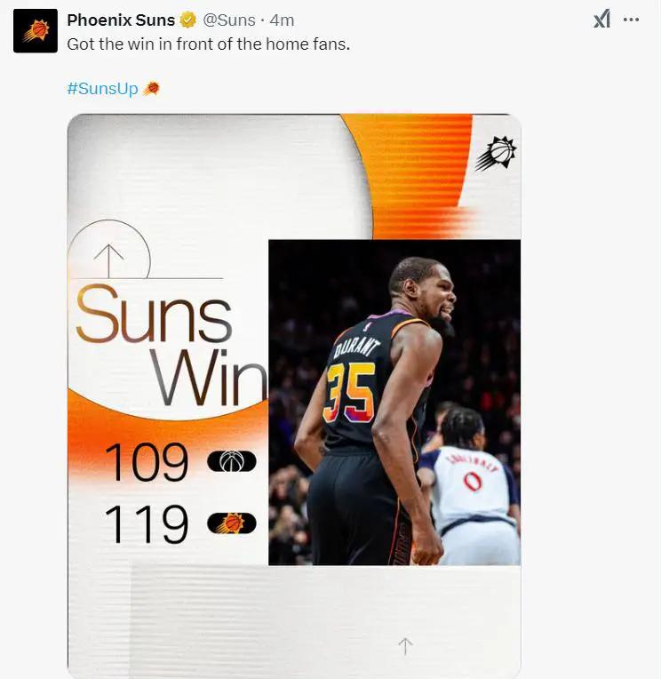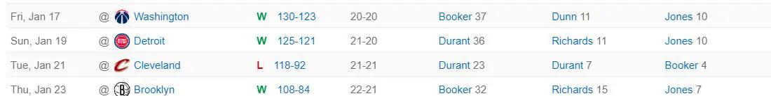 北京时间1月26日,菲尼克斯太阳以119-109击败华盛顿奇才,取得了二连胜。比赛一开始,太阳就在首节领先了11分,半场扩大到15分,虽然下半场奇才展开猛烈反击,末节一度将比分缩小到6分,但关键时刻杜兰特两罚全中,比尔造犯规后锁定了胜局。