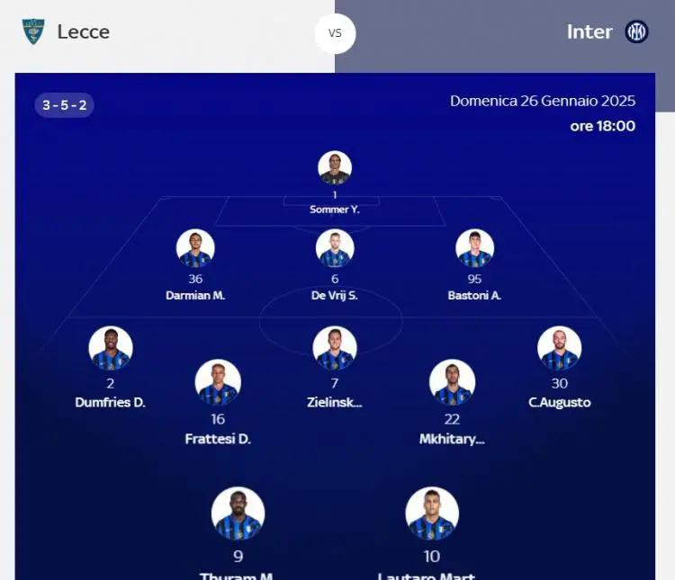 国际米兰将迎战莱切。意天空预测了本场比赛国米的首发阵容,相较于欧冠比赛,预计有4处人员轮换。