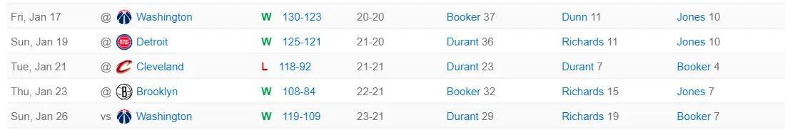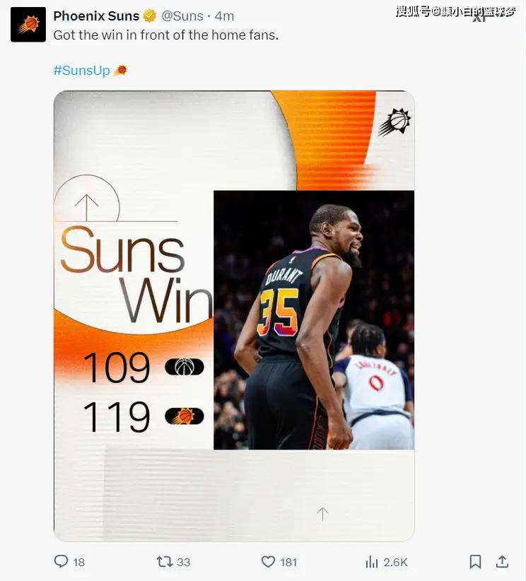 北京时间1月26日,菲尼克斯太阳119-109击败华盛顿奇才拿到二连胜。这场比赛太阳首节就领先11分,半场拉开到15分,下半场奇才疯狂追分在末节一度缩小到6分,可关键时刻杜兰特两罚全中,比尔造犯规后锁定胜局。