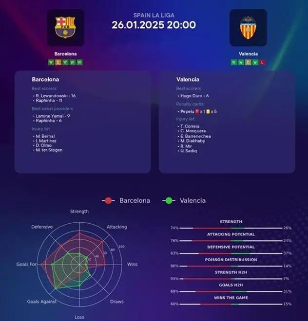 其实从历史交锋记录就能看出来,巴萨对阵巴伦西亚有明显优势。上一次巴萨输给巴伦西亚还是在2020年初,那场比赛他们在客场0-3输了。从那以后,巴萨和巴伦西亚交手了9次,巴萨赢了7场,另外两场打平,从来没输过。在这7场胜利中,巴萨平均每场能净胜对手差不多1.57个球。