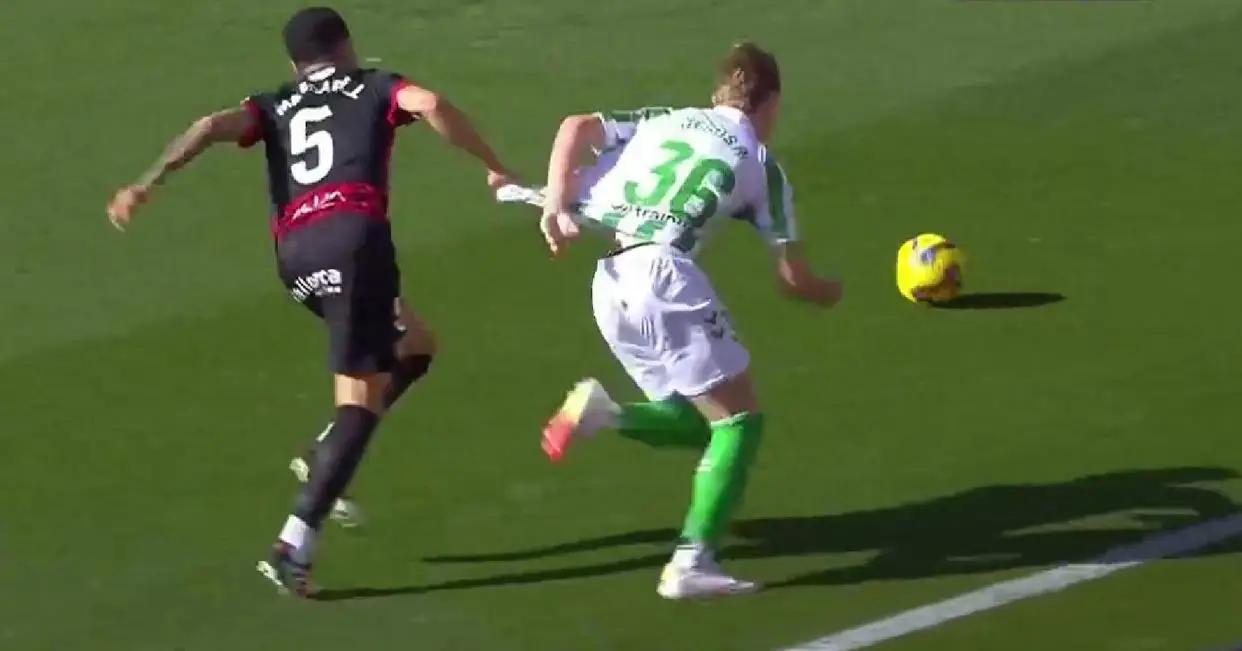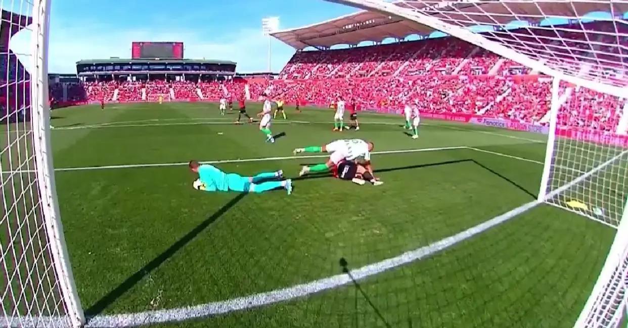 在第32分钟,皇家贝蒂斯的一次进攻中,当门将在高高跃起稳稳抱住皮球时,一名贝蒂斯球员却突然用身体猛烈撞击了门将。这一举动仿佛带着某种恶意,但在场的裁判对此并未作出任何判罚。