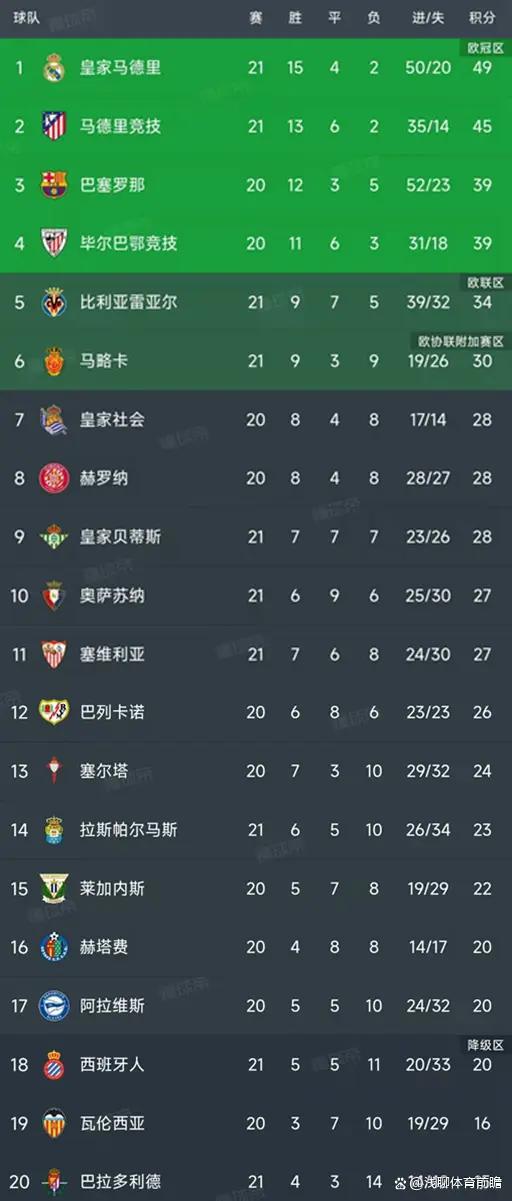 北京时间1月26日,西甲第21轮率先结束了5场比赛,我们一起看看最新的积分榜变动,主要的信息如下:皇马3-0完胜巴拉多利德,马竞1-1比利亚雷亚尔,塞维利亚1-1西班牙人,皇家贝蒂斯1-0马略卡、奥萨苏纳1-1拉斯帕尔马斯!