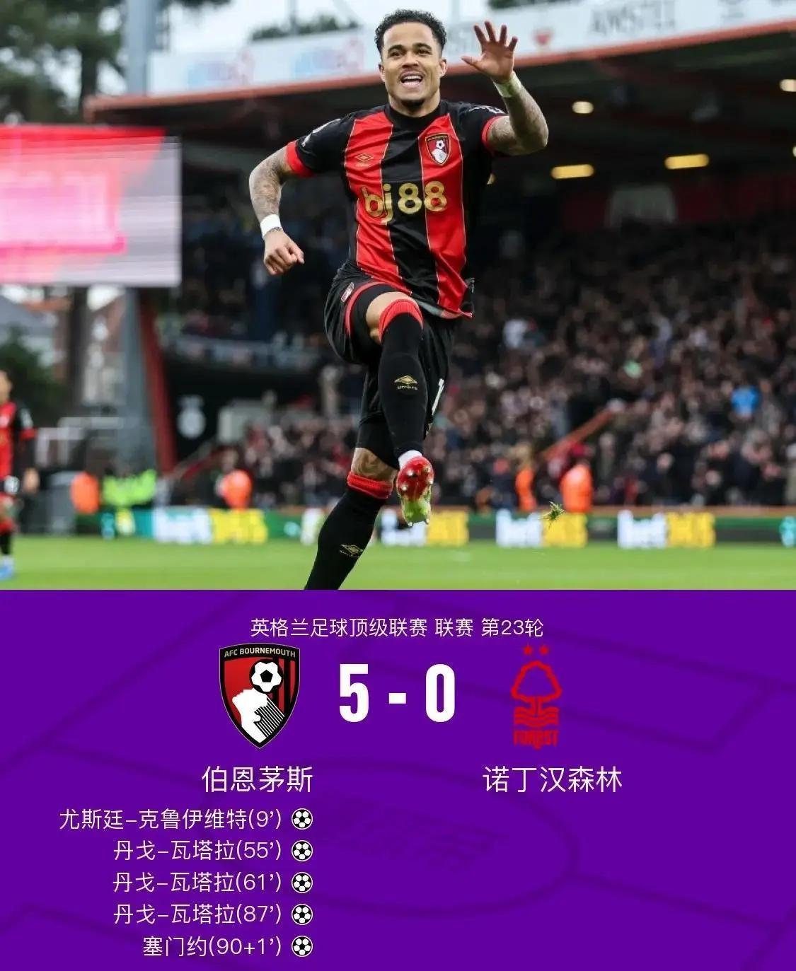 下半场开始后,双方打得更加激烈。第55分钟,克鲁伊维特助攻瓦塔拉进球,伯恩茅斯把比分扩大到2-0。第61分钟,亚当斯助攻瓦塔拉再次破门,伯恩茅斯3-0领先!