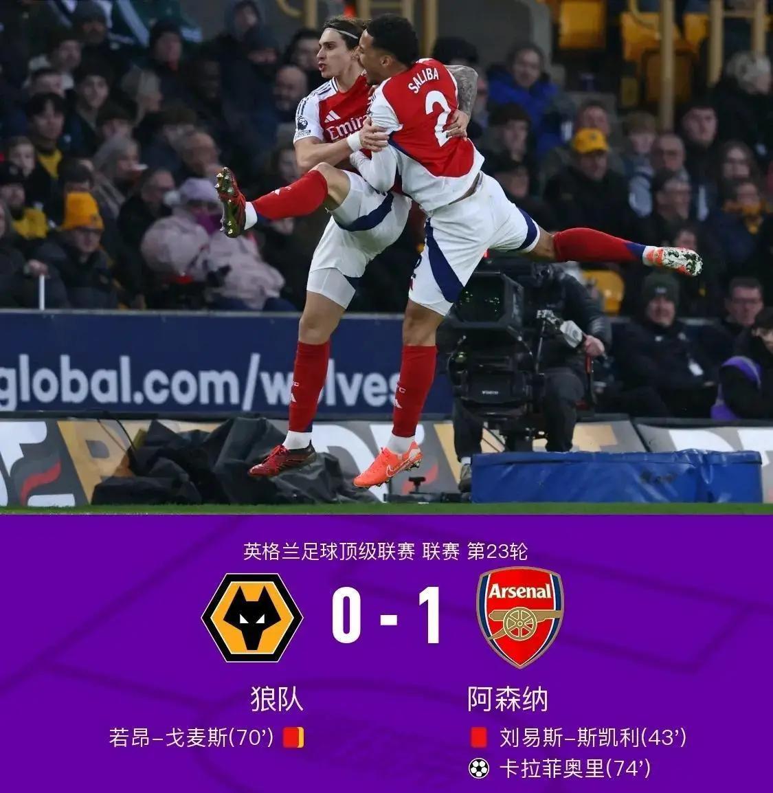 下半场开始后,两队打得更加激烈。第70分钟,狼队的戈麦斯也因为两张黄牌变成一张红牌被罚下场,狼队也只剩下十人。第74分钟,阿森纳在前场发动进攻,卡拉菲奥里在门前扫射破门,阿森纳终于取得了领先!之后双方都没有再进球。最终,阿森纳1-0战胜狼队,积47分上升到积分榜第二位,狼队则排在第17位。
