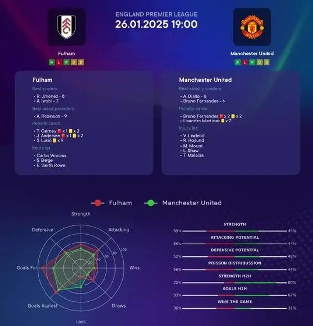 面对如此悬殊的胜率对比,曼联若想全身而退,或许更现实的目标应该是争取一场平局。毕竟,他们客场取胜的概率甚至不到富勒姆的一半。