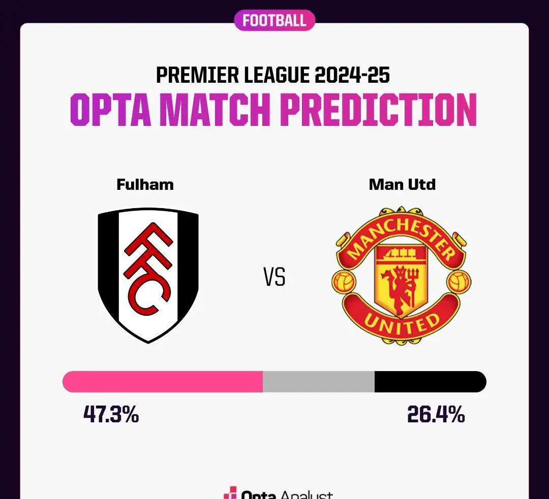 Opta对于这场比赛的预测显然偏向于富勒姆——他们获胜的概率为47.3%,而曼联的胜算仅为26.4%,双方打平的可能性则为26.3%。