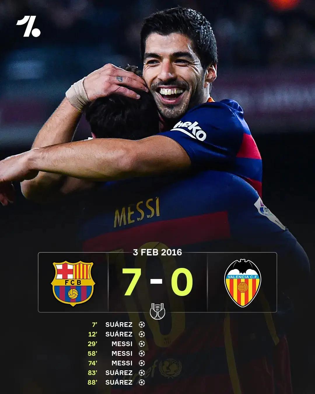 虽说瓦伦西亚本赛季只是一支西甲保级球队,巴萨7比1的比分还是十分夸张的,而红蓝军团1月的火力简直可以用势不可挡来形容。他们在国王杯两场比赛打进9球,西超杯决赛5比2横扫皇马,欧冠75分钟仍2比4落后的情况下5比4神奇逆转本菲卡,7场比赛打进29球,场均4球的效率相当夸张。