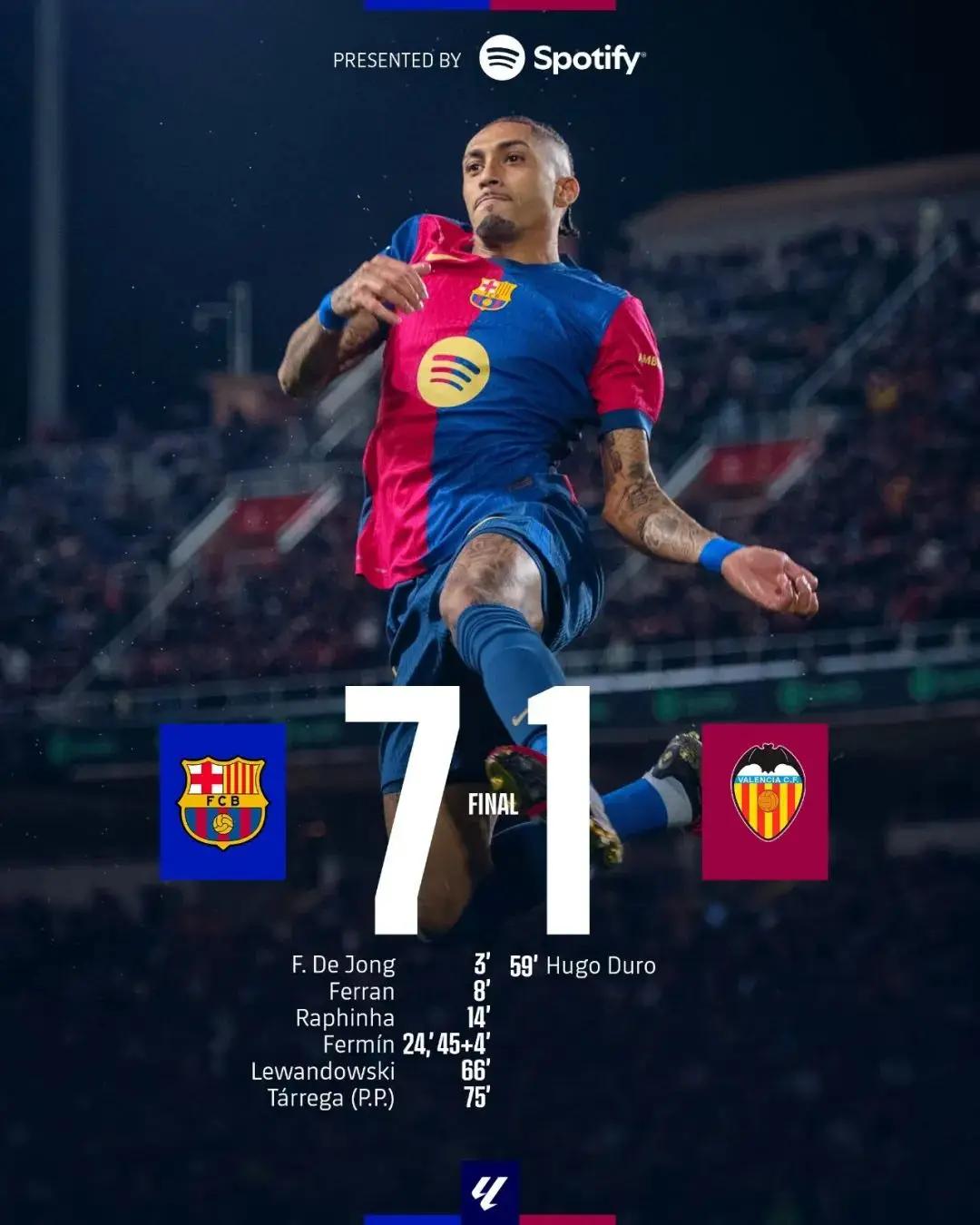 北京时间今天凌晨与瓦伦西亚的比赛,巴萨就开启了摧枯拉朽赢球的模式。弗朗基-德容和费兰-托雷斯的进球让红蓝军团开场8分钟就取得2比0的领先,之后拉菲尼亚、费尔明继续进球如麻,半场结束巴萨就打出了5比0的比分。易边再战,加泰罗尼亚巨人有所收敛,莱万还是完成破门,再加上瓦伦西亚的自摆乌龙,巴萨得以7比1血洗蝙蝠军团。