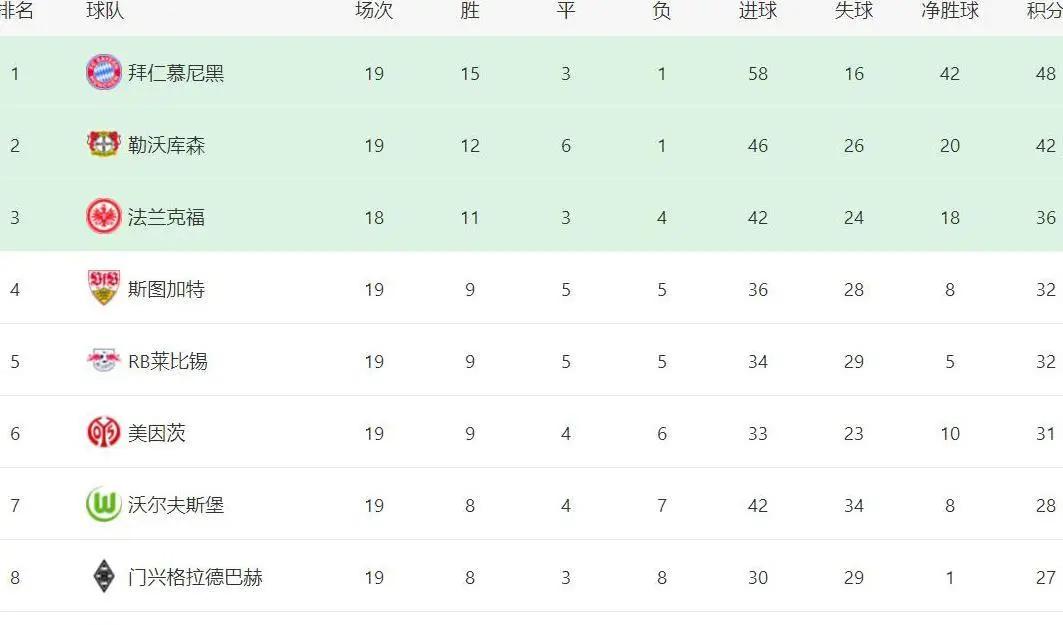 截至第19轮比赛结束,德甲积分榜的形势已经初步明朗。