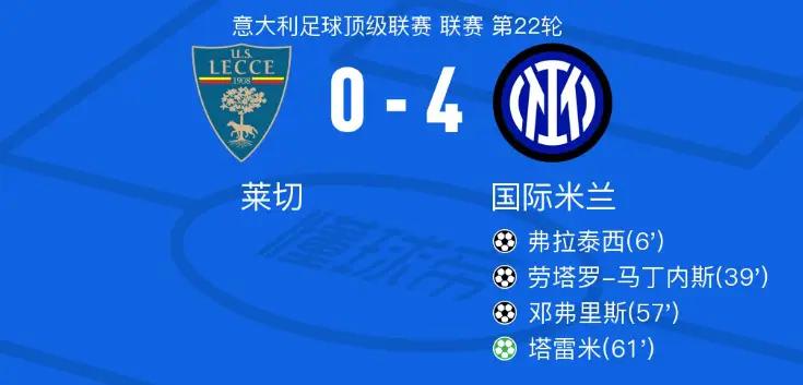 北京时间今天(1月27日)凌晨,在意甲第22轮的一场焦点大战中,国际米兰客场4-0大胜莱切。其中,阿根廷锋霸劳塔罗上演了1传1射的好戏,赛后也被评为全场最高的7.9分。