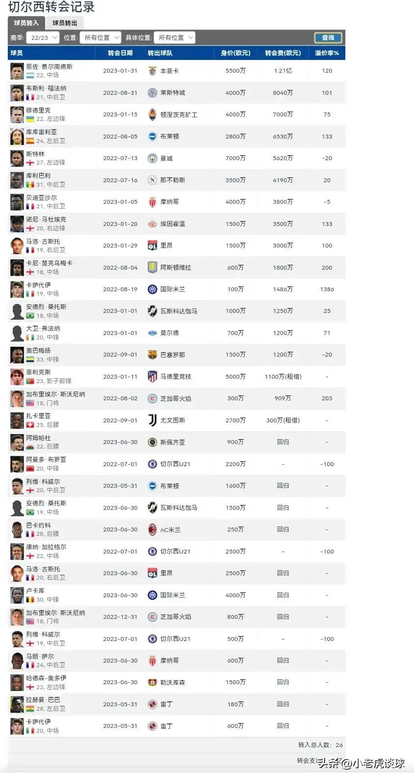2022-23赛季切尔西引援达到6.3亿欧元