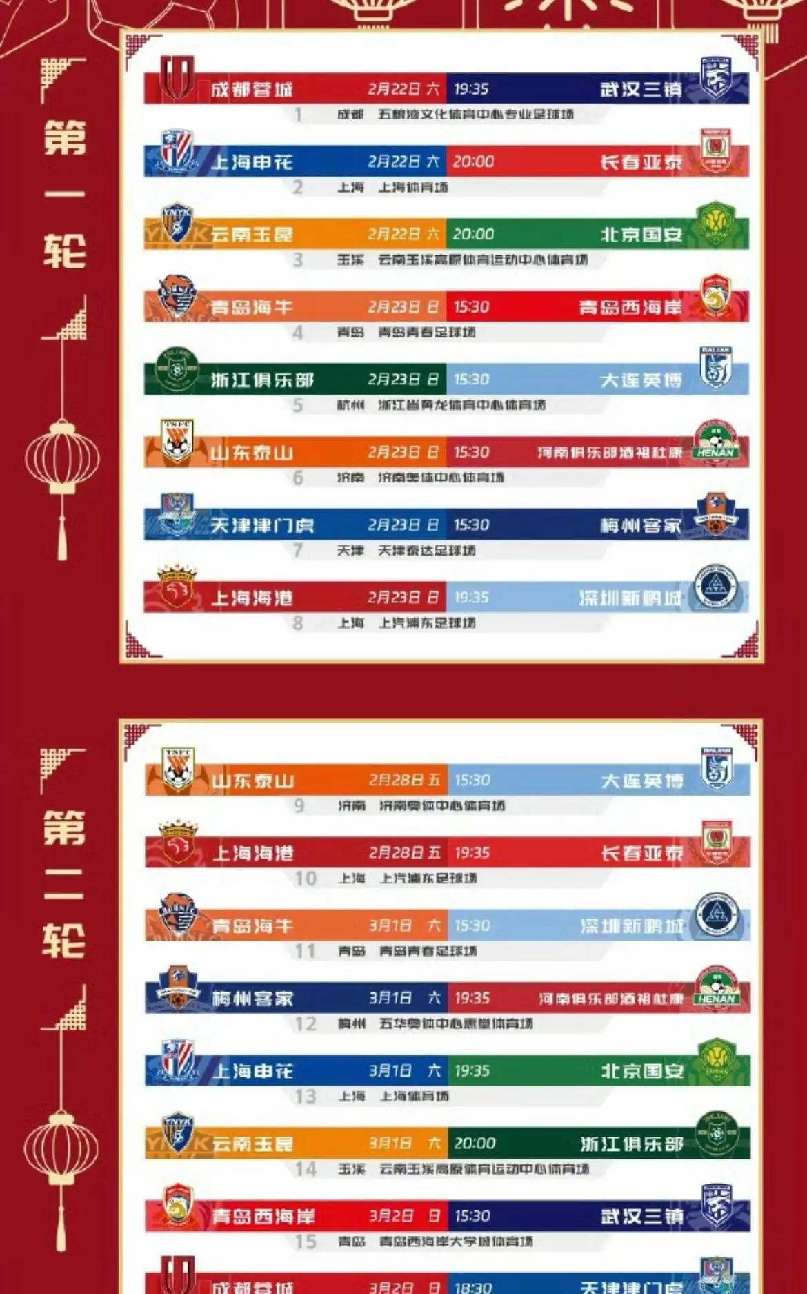 中超联赛官方发布了2025年的赛程,终于确定了比赛日期。由于3月份国足有两场世预赛,今年中超联赛提前到2月22日开始,将于11月22日结束。揭幕战将在2月22日19:35举行,成都蓉城将主场对阵武汉三镇,这支球队在近期发生了不小的变化。新赛季中超没有弱旅,争冠、争4和保级组将会是一场激烈的角逐,北京国安队引进了大批新援,海港队的实力有所下降。
