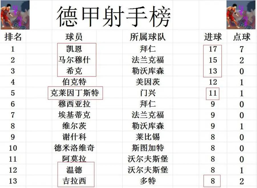拜仁小胜继续连胜,勒沃库森的8连胜被莱比锡终结,拜仁领先优势扩大到6分。美因茨击败斯图加特,在争四中占据有利位置,莱比锡逼平勒沃库森拿到1分。斯图加特仅以3个净胜球优势排第4,莱比锡紧随其后,美因茨则落后1分。多特不敌不来梅,排名降至第11位。