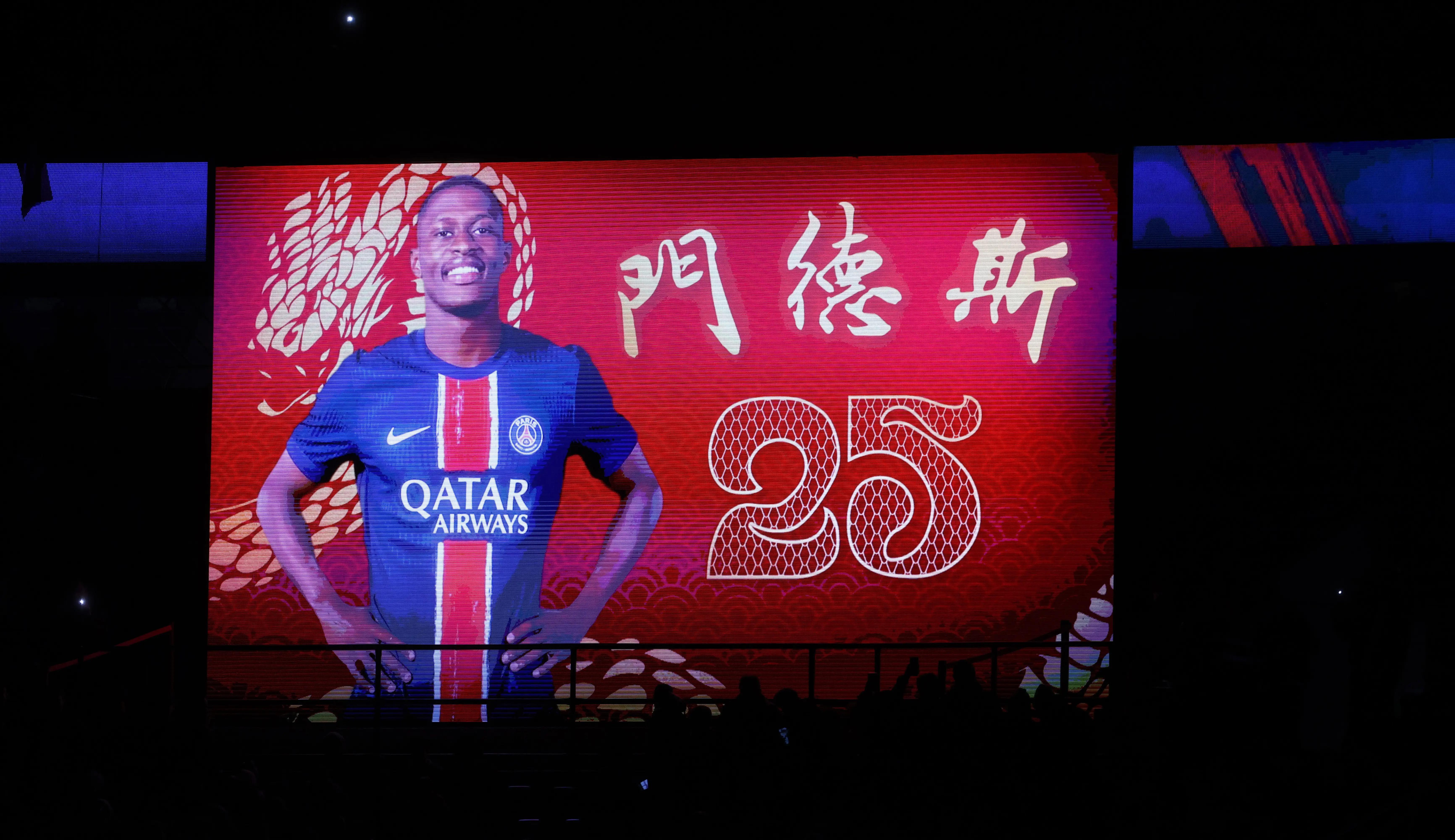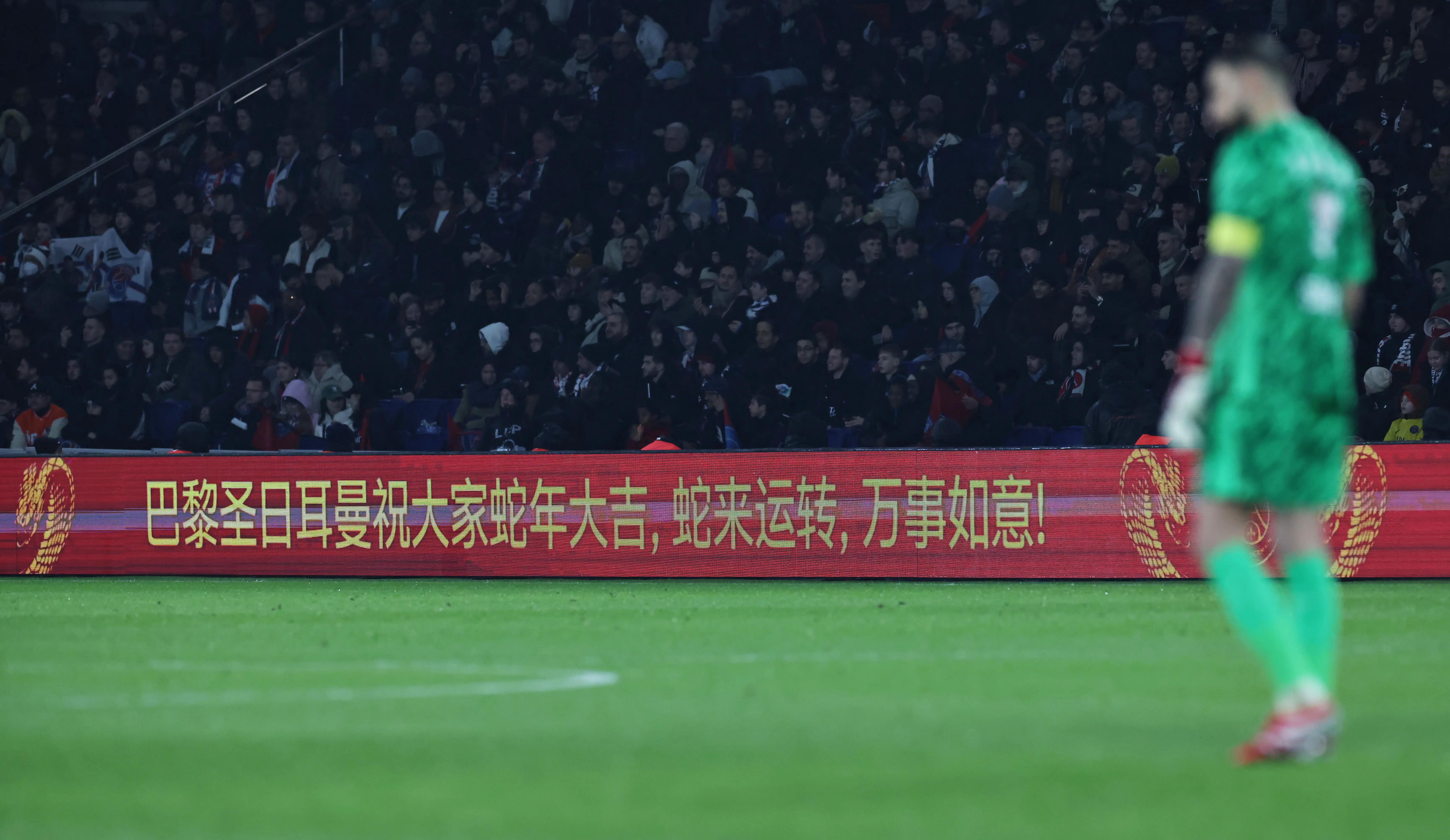 1月25日,在法国巴黎王子公园球场举行的巴黎圣日耳曼队与兰斯队比赛赛前,大屏幕用中文和蛇年春节元素介绍上场球员。球员身上的球衣印有中文和蛇年元素,场边的广告屏上也显示着迎接蛇年春节的祝福语,春节氛围满满。