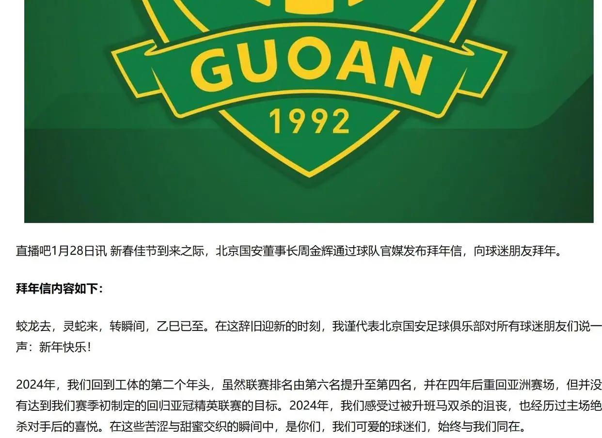除了张玉宁向大家致以新春祝福之外,北京国安的董事长也通过俱乐部官方微博向球迷们拜年。他提到,在刚刚过去的2024年里,我们曾品尝过被升班马双杀的苦涩滋味,但依然坚守着青训学院建设的理念。展望未来,2025年我们将怀揣着满腔热血,在每一个赛场上全力以赴,为实现赛季目标奋力拼搏。这正如一位老将面对挑战时所言:“真正的勇士,不是从未跌倒,而是每次都能重新站起。”